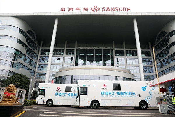 目前,北京、廣東、黑龍江、四川、山東等多省均已配置移動(dòng)核酸檢測車。圣湘生物此次投入使用的移動(dòng)P2+核酸檢測車共2臺,為湖南省首批投入使用的移動(dòng)核酸檢測車,可實(shí)現(xiàn)采樣、檢測、報(bào)告一站式服務(wù),2臺日檢測量(10混1)可達(dá)10萬人份,最快45分鐘內(nèi)出結(jié)果!