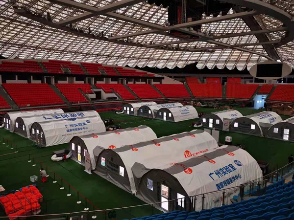 五月底,圣湘生物技術(shù)工程師、試劑儀器和一系列抗疫物資陸續(xù)到位,廣州體育館里正在火速建設(shè)“獵鷹號”氣膜實驗室。