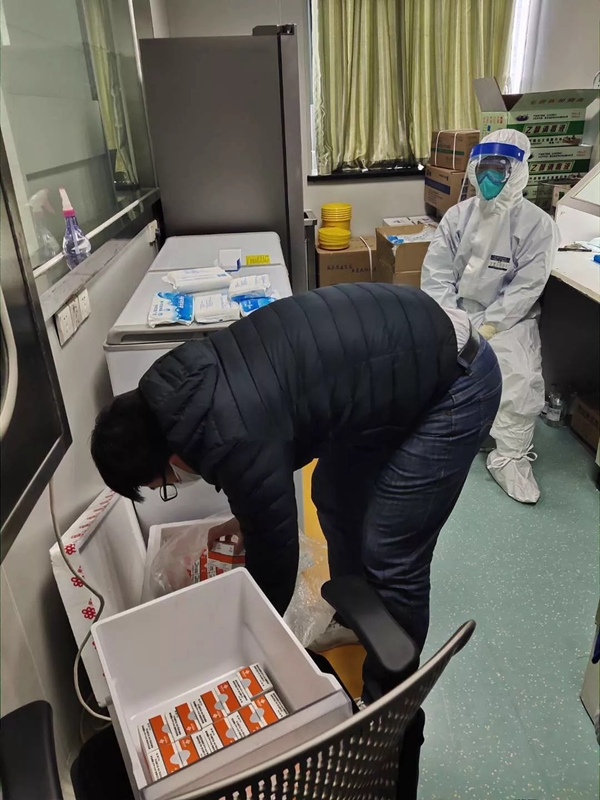 圣湘生物捐贈的第一批醫療設備、試劑以及配套耗材,順利抵達武漢。與當地合作商一起,裝運貨物入庫。
